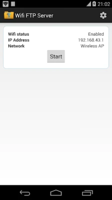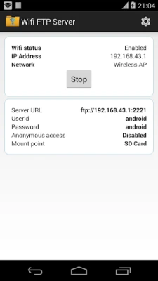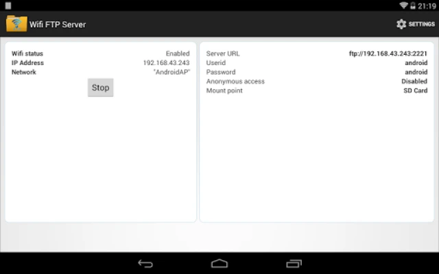 Port number should be greater than 1024 as binding to ports like 21 will not be possible on non-rooted phones. The default port number is configured to 2221 and can be changed from settings screen. For security reasons, anonymous access is not enabled by default. It can be enabled from settings screen.